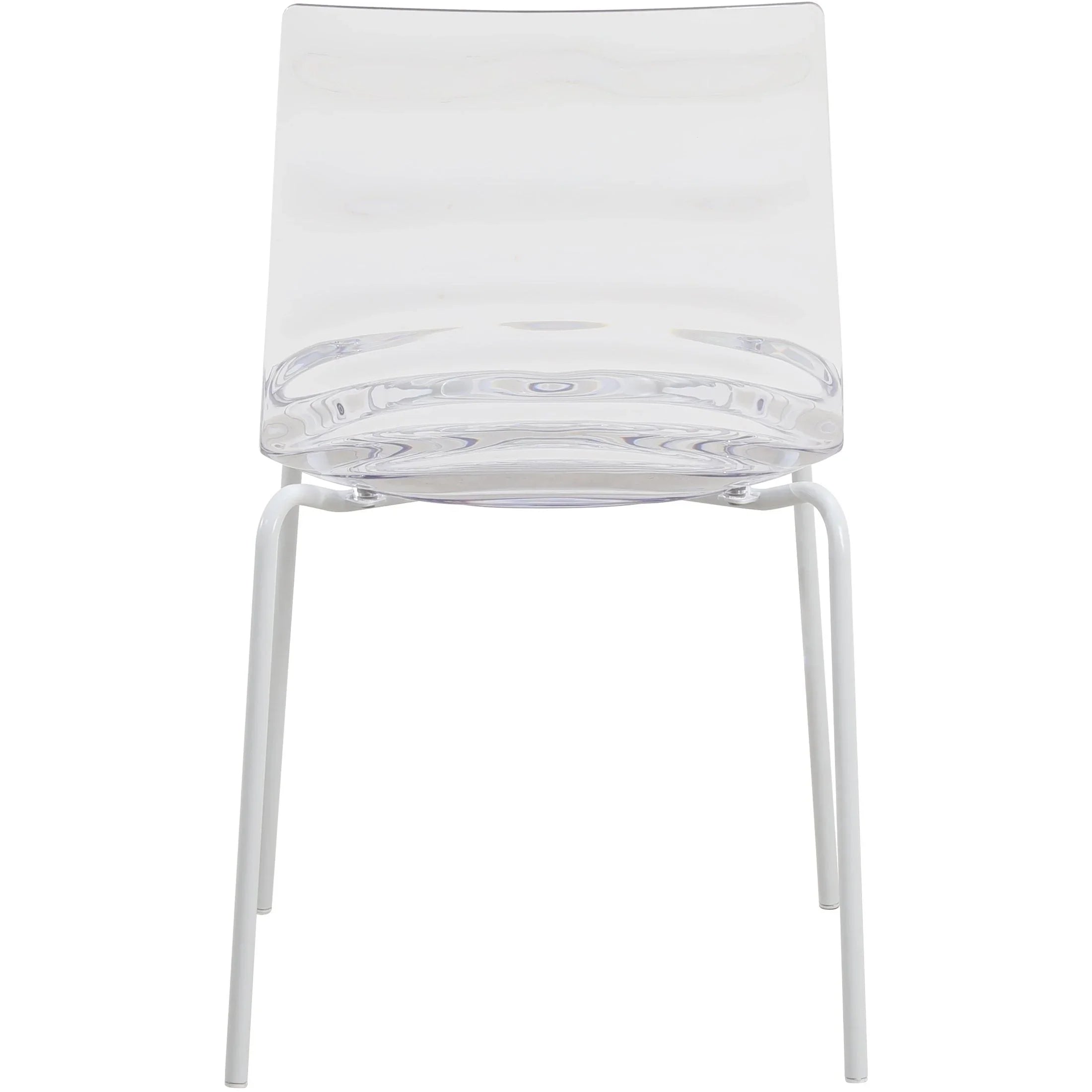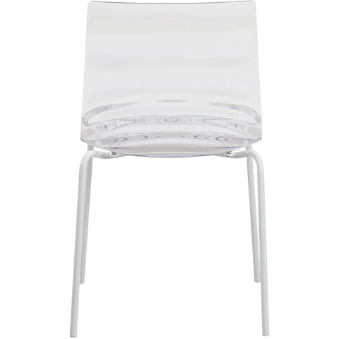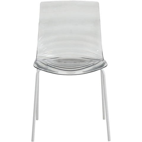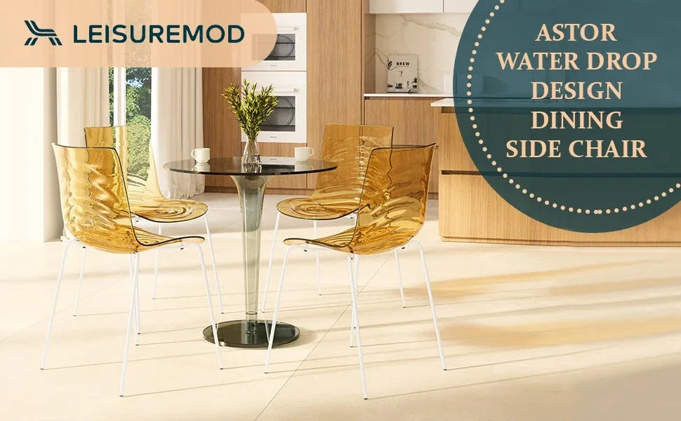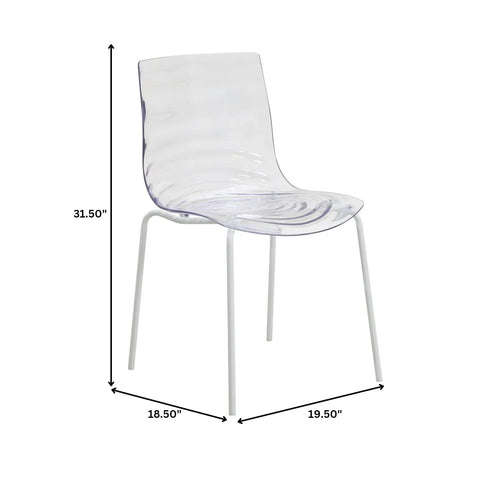 Blending elegance and functionality. Its sleek, transparent seat with a unique ripple pattern offers style and comfort. Made from durable ABS plastic, it's perfect for indoor and outdoor use. Supported by sturdy metal legs with floor protectors, it's easy to move, clean, and assemble, ensuring a hassle-free setup in any dining environment.