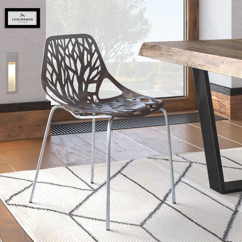 Introducing the Asbury Modern Forest Design Dining Side Chair. Its intricate cut-out design and woodsy feel add a modern and unique touch to any space. Ideal for a minimalist dining table or as a standalone chair in an entryway, this chair will bring a touch of nature to your home. Made from high-quality materials, it is also a perfect addition to restaurants. Upgrade your space with this one-of-a-kind chair.