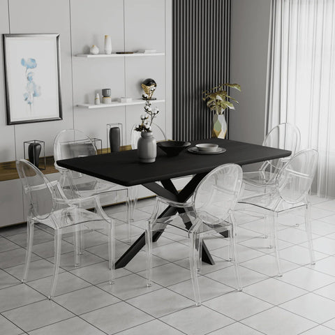 The Carroll Modern Acrylic Dining Chair, Set of 4, boasts an unparalleled blend of durability and creativity. These chairs are versatile, stackable, and suitable for both indoor and outdoor use, making them perfect for any occasion or space. With a design that seamlessly blends into any room, these chairs are an artistic representation of American furniture. The unique rounded seats and medallion backs add a touch of contemporary baroque style.