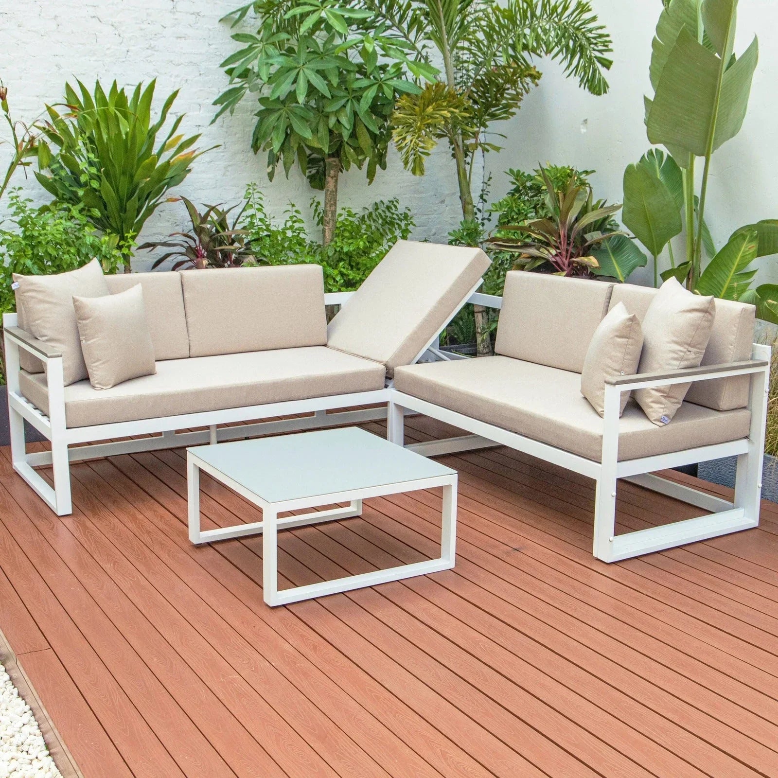 Set up a spot for Fresh air, chilled drinks & warm breezes, whether you're looking to host the neighbors in style or just spread out to enjoy warmer weather there's no better way to extend your living space than with our Chelsea modern outdoor sectional set. We have a professional outdoor design team, focusing on the design of high-quality and weather resistance outdoor sectional sets. We have a professional outdoor design team, focusing on the design of high-quality and weather resistance outdoor sectional sets. The solid structure frame ensures stability, and guess what? the cushions come with ties to lock them in place so as not to be misplaced or disorganized when stronger winds are around. Sitting enough for six to ten people, set the sectional in the modern L-Shape style or it comes with an extra armrest so you can separate it to make into a Sofa and Loveseat set, lie down in comfort with the adjustable headrest to be used as a lounger or chaise, however you like it to help you make the most out of your patio or deck.