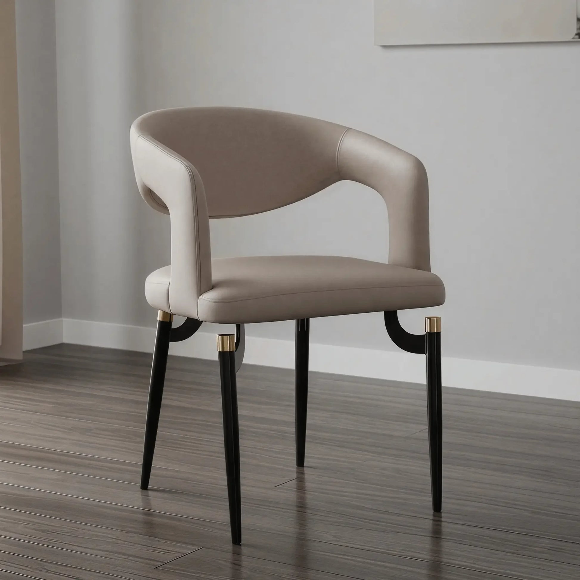 Elevate your dining experience with the sophisticated Entice Modern Dining Chair. Crafted with plush leather upholstery and sleek, curved open backrest, it offers unparalleled comfort and support. Designed for extended seating, it seamlessly blends elegance with durability. Easy to maintain with protective iron legs, it comes with rubber pads for floor protection.