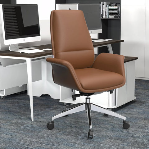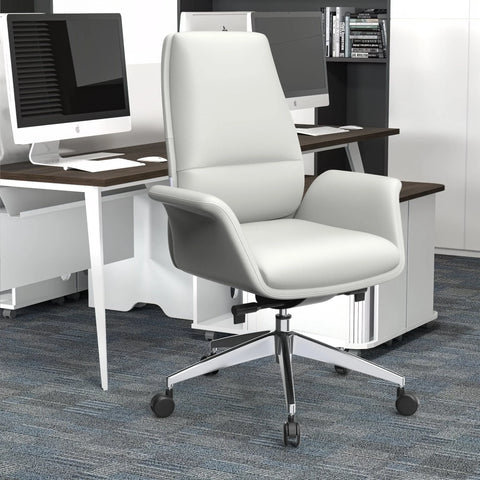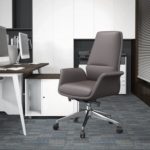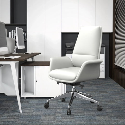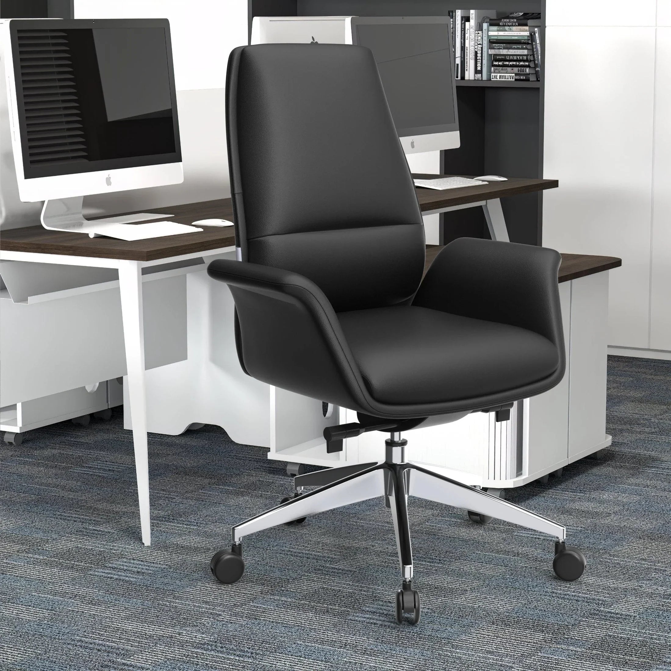 Upgrade your office space with the Summit Mid-Century Modern Faux Leather Conference Office Chair. The sleek aluminum frame guarantees durability while the faux leather upholstery and plush sponge filling offer superior comfort. The adjustable height and fixed armrests allow for a customized seating experience, making it both stylish and functional. With easy assembly and swivel functionality, this chair is a perfect addition to any workplace.